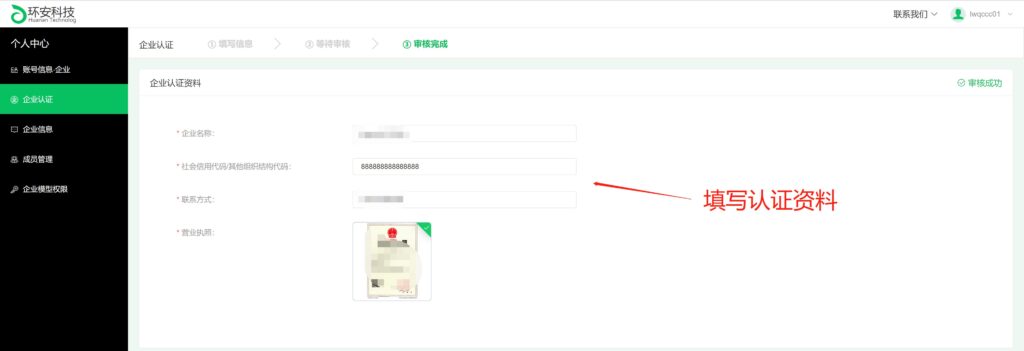 登录初次注册的企业账号,将鼠标移动至账户中心,点击“个人中心”,点击“立即认证”,按照企业营业执照信息上传企业认证资料,上传完成后等待后审核。用户也可以拔打环安客服热线4006868186获取审核进度。审核通过后,企业账户才能进行后续成员管理和企业权限分配。